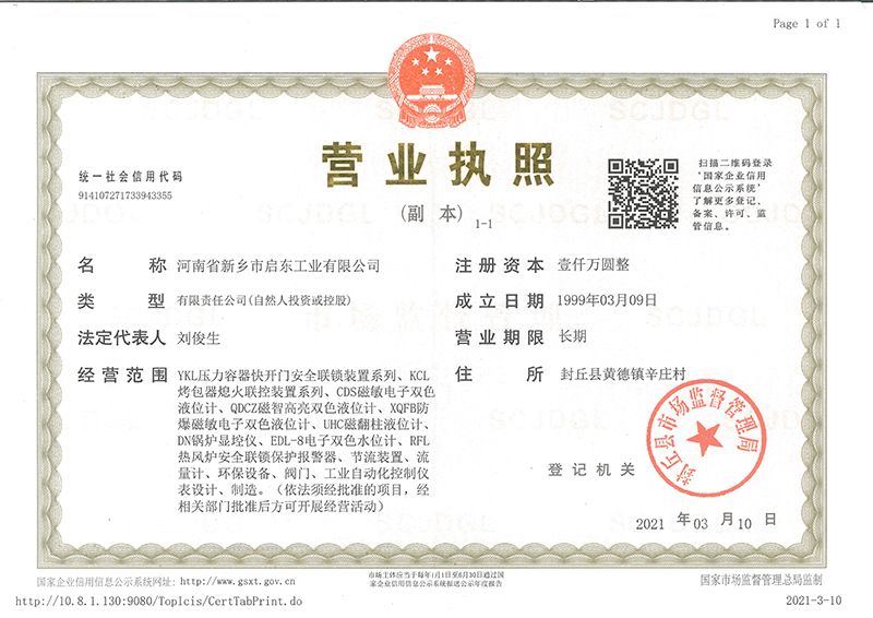 河南省新鄉(xiāng)市啟東工業(yè)有限公司始建于1987年,是專注研發(fā)、生產(chǎn)自動(dòng)化儀器儀表(主要與壓力容器、鍋爐等容器配套使用)的廠家。主要產(chǎn)品有液位計(jì)(磁敏雙色型、磁翻柱型等)系列、烤包器熄火聯(lián)控裝置系列、壓力容器快開(kāi)門安全聯(lián)鎖保護(hù)裝置系列、鍋爐報(bào)警器系列。二十多年來(lái),公司產(chǎn)品暢銷國(guó)內(nèi)并遠(yuǎn)銷俄羅斯、蒙古與東南亞,深得廣大用戶的信賴和好評(píng)。我們多年來(lái)致力于自動(dòng)化儀器儀表的研制生產(chǎn),公司現(xiàn)具有完善的生產(chǎn)、試驗(yàn)、檢測(cè)手段和設(shè)備。科技創(chuàng)新、誠(chéng)信服務(wù),是我們不變的經(jīng)營(yíng)理念,我們將以強(qiáng)有力的技術(shù)支持及售后竭誠(chéng)為客戶提供良好的服務(wù)。  2012年我公司成功研發(fā)了KCL系列烤包器熄火聯(lián)控裝置,并于2013年2月2日榮獲中華人民共和國(guó)國(guó)家知識(shí)產(chǎn)權(quán)局辦法的《實(shí)用新型**證書》<**號(hào):2021202257735>該產(chǎn)品廣泛應(yīng)用于唐鋼等大型鋼鐵企業(yè),為烤包器安全作業(yè)提供了有力的保障。  2002年我公司成功研發(fā)磁敏電子雙色液位計(jì)獨(dú)特的高亮度LED紅綠雙色顯示,獲得了專家的首肯和用戶的一致好評(píng)。在此基礎(chǔ)上我公司研發(fā)人員十年磨一劍,致力于XQFB-1防爆型磁敏雙色液位計(jì)的研發(fā),于2013年12月27日由國(guó)家防爆電器產(chǎn)品質(zhì)量監(jiān)督檢驗(yàn)中心檢驗(yàn)合格并頒發(fā)防爆合格證書<編號(hào):cnex19.0883>。該產(chǎn)品性能得到了充分的發(fā)揮,廣泛應(yīng)用于含有Ⅱ類A·B級(jí)T1-T4組可燃?xì)怏w或蒸汽與空氣混合形成的爆炸性混合物的0區(qū)、1區(qū)危險(xiǎn)場(chǎng)所。連接用戶DCS或PLC系統(tǒng)實(shí)現(xiàn)遠(yuǎn)距離集中顯示和控制,從而實(shí)現(xiàn)節(jié)能、數(shù)字化管理。為用戶增加了一定的經(jīng)濟(jì)效益和社會(huì)效益,。2014年公司成功申請(qǐng)了夢(mèng)潤(rùn)儀表的logo,新的品牌新的形象,夢(mèng)潤(rùn)儀表是啟東的LOGO, 歡迎新老用戶前來(lái)洽談合作。  我們一如既往地注重科研的投入,憑借產(chǎn)品的不斷更新、加大科技含量,進(jìn)一步拓展市場(chǎng)。我們相信品質(zhì)成就未來(lái),以過(guò)硬質(zhì)量、優(yōu)惠價(jià)格、完善的售后服務(wù)熱忱歡迎廣大客戶來(lái)我司視察指導(dǎo)、洽談業(yè)務(wù);精誠(chéng)合作,共創(chuàng)輝煌!